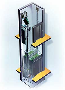 С тех пор как в 1855 году американец Элайша Грейвс Отис изобрел первый в мире безопасный лифт, исключавший возможность падения кабины при обрыве канатов, устройство лифтов не претерпело существенных изменений. Конструкция подъемных машин довольно консервативна, и главная цель новых технических разработок - повышение надежности всех элементов и узлов лифтового оборудования. Лифты сегодня выполняют самые разнообразные Электрический лифт - это классический вариант конструкции подъемника с тяговыми канатами и двигателем. В редукторной или безредукторной системах с канатоведущим шкивом, применяющихся соответственно для подъема на среднюю и большую высоту, кабина лифта удерживается в шахте несколькими стальными шахтными канатами, обычно двумя шкивами и противовесом. Вес кабины и противовеса обеспечивает достаточное сцепление между шкивами и шахтными канатами, чтобы шкивы могли удерживать канаты, двигать и удерживать кабину без излишнего проскальзывания. Кабина и противовес движутся по вертикальным направляющим, которые служат для предохранения от раскачивания. Механизм, приводящий лифт в движение, находится в машинном помещении, которое находится прямо над лифтовой шахтой. Для подводки электричества к кабине и получения от нее электрических сигналов используется многожильный электрический кабель, связывающий машинное помещение с кабиной. Его конец, прикрепленный к кабине, движется вместе с ней, поэтому кабель называется "подвесным". Редукторная лебедка оснащена более скоростным двигателем, а канатоведущий шкив соединен с валом двигателя посредством зубчатой передачи в редукторе, который снижает скорость вращения вала двигателя до более низкой скорости канатоведущего шкива. Безредукторная лебедка имеет низкоскоростной двигатель, а КВШ соединен с валом двигателя напрямую. |