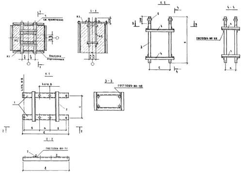 Для вертикальных связей жесткости и опорных поддерживающих балок используют типовые схватки из комплекта опалубки «Монолит-77». При требуемой длине > 3,5 м схватки выполняются составными, собираемыми из типовых схваток длиной 2; 2,5 и 3 м.