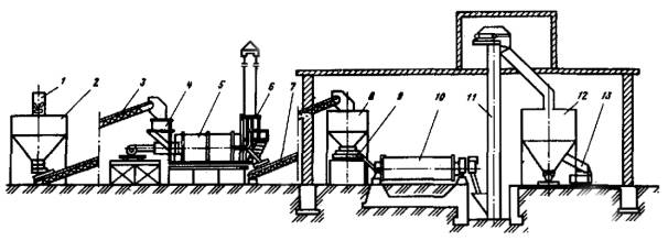 1 - транспортер для подачи отсева или щебня в накопительный бункер; 2 - накопительный бункер; 3 - транспортёр для питания сушильного барабана; 4 - емкость для объемного дозирования; 5 - сушильно-смесительный агрегат; 6 - дозировочный бачок для активирующей смеси; 7 - транспортер для подачи материала в накопительный бункер; 8 - накопительный бункер; 9 - питатель; 10- шаровая мельница;11 - элеватор для готового минерального порошка; 12 - раздаточный бункер;13 - шнек для загрузки транспортныхсредств.