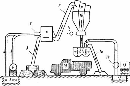 Рис. 2. Схема движения составных компонентов асфальтобетонной массы при изготовлении на стационарной установке: 1 - открытые штабеля щебня; 2 - открытые штабеля песка; 3 - холодный элеватор для инертных компонентов; 4 - сушильный барабан; 5 - нефтехранилище; 6 - паросиловое оборудование; 7 - форсунка; 8 - горячий элеватор; 9 - грохот сортировщик; 10 - секционный бункер-накопитель; 11- весы-дозатор; 12 - битумохранилище; 13 - битумоварочный котел; 14 - битумопровод с насосом; 15 - крытый склад заполнителя; 16 - транспортер для заполнителя; 17 - лопастной смеситель; 18 - автомобиль-самосвал, принимающий готовую массу