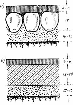 Рис. 4. Структура асфальтобетонного покрытия: а) на основании типа булыжной мостовой; 6} на цементобетонном основании