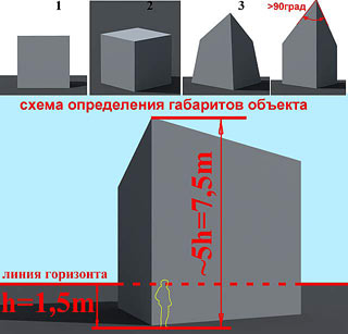 2. Несет в себе наибольшее количество ошибок. Во-первых точка зрения парит где-то в облаках. Один из основных принципов архитектурной подачи в том, что точка зрения (местоположение камеры) должна соответствовать реально существующей точке на уровне глаз среднего человека (обычно принимается 1.5 метра). Исключениями бывают специальные подачи с высоты птичьего полета. Используются для визуализации крупных объектов (микрорайон, район, поселок), которые с человеческой точки зрения видны только малой своей частью. Нарушение этого правила приводит к тому, что по такому изображению невозможно оценить размер объекта. Если же правило «человеческой точки зрения» соблюдено, то даже не имея на изображении никаких других элементов известного размера, можно представить габариты объекта.(смотри схему определения габаритов объекта) Во-вторых практически отсутствуют перспективные искажения... то есть вид близок к аксонометрии. Подача в виде аксонометрии может существовать, но тогда это должна быть честная аксонометрия или диметрия, а не слабенькая, почти не заметная перспектива. И в-третьих, взгляд направлен точно в ребро куба и оба его «фасада» практически одинаково «раскрываются» на зрителя. Эта ошибка очень часто встречается в архитектурных визуализациях. Обязательно нужно «отдавать предпочтение» одному из фасадов и поворачивать его к камере больше, чем другой. И источник света направлять на этот предпочтенный фасад. (о постановке света мы поговорим отдельно).