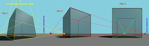 Прежде чем я представлю обещанную схему, я хочу сделать небольшое отступление на тему перспективы. Трехмерная графика потому и называется трехмерной, что все объекты имеют размеры в трех измерениях (длинна, ширина и высота). Перспективное изображение это симуляция трехмерного вида на двухмерной плоскости (монитор, лист бумаги и.т.п.) От других типов отображения трехмерной информации на плоскости (аксонометрии, диметрии, плана с отметками) перспектива отличается тем, что она наиболее близка к тому, как человек воспринимает окружающий его мир и основана на понятии «перспективное сокращение». Перспективное сокращение это видимое уменьшение размеров объекта с удалением от точки зрения (положения камеры). Чем дальше объект, тем он меньше. Бесконечно далекий объект имеет нулевой размер и находится на линии горизонта. Линия горизонта находится на уровне точки зрения (положения камеры). Все линии параллельные земле сходятся на линии горизонта. Все параллельные линии параллельные земле сходятся на линии горизонта в ОДНОЙ точке (точке схода). Рассматривая архитектурную визуализацию на примере куба (а практически любой архитектурный объект можно представить в виде куба, параллелепипеда иди набора из нескольких подобных тел) мы можем говорить о трехточечной перспективе. Поскольку у нас есть три комплекта перпендикулярных друг другу и параллельных между собой рёбер, то мы имеем три точки (две на горизонте и одна в небесах или под землей), где продолжения наших рёбер пересекутся. (смотри рисунок 1). Поскольку мы решили, что «падающие вертикали» это не характерный и весьма специфичный для визуализации прием, то расположив направление нашего взгляда перпендикулярно вертикалям (и параллельно земле) мы получим двухточечную перспективу (рисунок 2), которая и является основной в арх. визуализации. Еще более частным случаем является одноточечная перспектива (рисунок 3) это, когда взгляд перпендикулярен не только вертикалям, но и грани нашего куба. Такая перспектива используется для фасадной визуализации иди для подачи протяженных объектов (взгляд вдоль улицы, парка и.т.п)