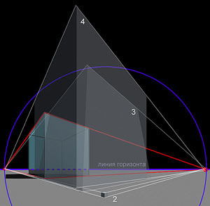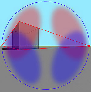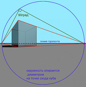 И вот перед вами обещанная схема. К предыдущей схеме с точками схода и горизонтом добавилась одна деталь - это окружность, диаметр которой определен точками схода. Как известно из курса школьной геометрии треугольник двумя углами опирающийся на диаметр окружности, а третьим углом лежащий на этой окружности - прямоугольный. То есть, указанный мною угол всегда равен 90 градусам. Из этого следует, что какой бы мы не взяли куб или параллепипед и как бы мы на него не посмотрели, то, если он будет находится внутри вышеозначенной окружности, перспективных искажений и аббераций не будет. А как только он выйдет за пределы этого круга, они (абберации)сразу же повылязят.