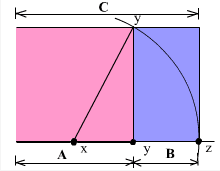 Построим сначала квадрат (выделен розовым цветом). Затем разобьем основание квадрата пополам ( точка X). Будем считать точку Х центром окружности, одной из точек которой является вершина квадрата Y. Затем построим окружность до пересечения с продолжением нижней стороны квадрата (точка Z), и построим через точку Z прямоугольник. В результате мы получим прямоугольник с соотношением сторон 5:8. Отношение величин отрезка А к отрезку С, такое же как отрезка В к отрезку А. Отношение 5:8 очень близко к отношению сторон стандартного листа бумаги (А3, А4 и.т.д)