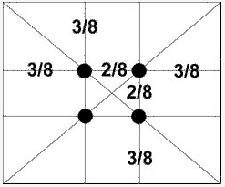 Другим примером использования правила "Золотого сечения" - расположение основных компонентов кадра в особых точках - зрительных центрах, Таких точек всего четыре, и расположены они на расстоянии 3/8 и 5/8 от соответствующих краев плоскости. Человек всегда акцентирует свое внимание на этих точках, независимо от формата кадра или картины.