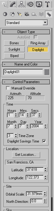 Такой способ постановки солнца является «хорошим тоном» архитектурной визуализации, поскольку именно на эти дни делаются все расчеты инсоляции. Конечно, может оказаться, что такое положение солнца для выбранной вами точки зрения на объект совсем не выгодно. Тогда предлагаю действовать по второму пути. Это расположение направления распространения солнечных лучей под углом близким к 90 градусам к направлению взгляда и 45 градусов относительно земли