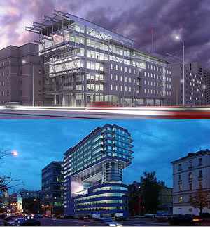 5. Если в кадре присутствует элемент динамики (то есть структура изображаемого здания такова, что части его перетекают в друг друга с явным изменением размеров, масштаба, материалов и.т.п. вдоль какого-то одного направления), то ее желательно подчеркнуть антуражем (например, едущие в том же направлении автомобили) и в направлении движения в кадре оставить больше свободного места, как бы оставляя пространство для этого движения, а не останавливая его краем кадра.