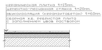 | 1 | Постоянная: керамическая плитка t=15мм. цементно-песчаная стяжка t=20мм. звукоизоляция (керамзитобетон) t=60мм. Нагрузка от пола Сборная ж. б. ребристая плита с заполнением швов раствором ИТОГО: |