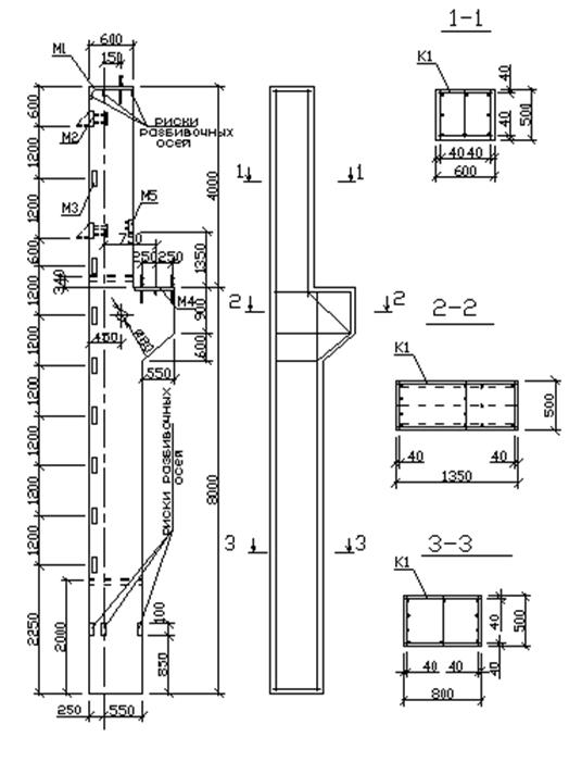 Ветви двухветвевой колонны в нижней части соединяют распорками, расстояние между осями которых принимают (8...12) hw , где hw - меньший размер поперечного сечения ветви. Высоту сечения рядовой распорки принимают равной (1,5...2) hw , а верхней - не менее удвоенной высоты сечения рядовой распорки. Расстояние от уровня пола до низа первой надземной распорки для обеспечения удобного прохода принимают не менее 1,8 м. Армирование распорок обычно симметричное.