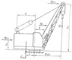 Величины моментов действующих сил зависят от угла наклона площадки, на которой стоит кран, положения стрелы и груза. Совместное действие всех сил, неблагоприятно влияющих на устойчивость крана, приводят к его опрокидыванию. Поэтому краны проектируют так, чтобы при любых условиях как в рабочем, так и в нерабочем состоянии была обеспечена их устойчивость. В расчетах при определении устойчивости крана различают грузовую и собственную устойчивость. Степень устойчивости крана определяется коэффициентом грузовой устойчивости