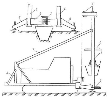 1 - трамбовка; 2 - направляющая рама; 3 -система блоков; 4 - направляющая стойки;5 - противовес; 6 - каретка;7 - подвеска; 8 - элементы жесткости; 9 - аутригер