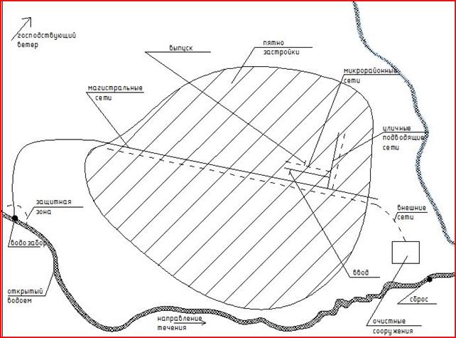 Под застройку выбран юго-западный склон для создания нормальных условий инсоляции. По берегам водоема и реки организованы 2 защитные зоны 100 м и 300 м, вдоль трассы внешнего транспорта защитная зона составляет 100 м.