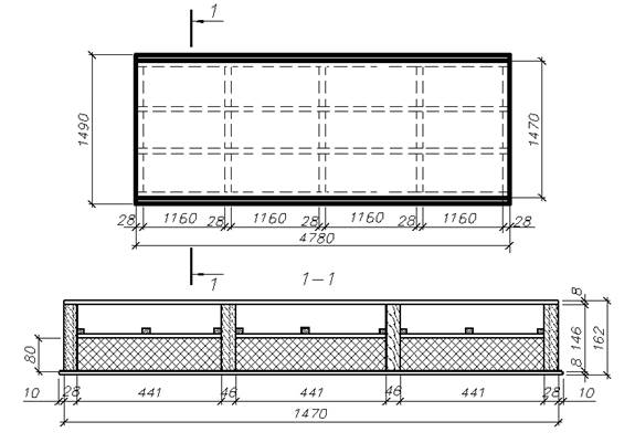 Обшивки толщиной по 14 мм предварительно состыкованы по длине. Под стыками обшивок и в торцах предусматриваем поперечные рёбра. Плиту рассчитываем как свободно лежащую на двух опорах однопролётную балку. Торцевые и поперечные ребра принимаем составного сечения высотой 120 мм и толщиной 46 мм. Число поперечных ребер – 3, что обеспечивает расстояние между ними не более 1,5 м.