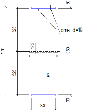 Определяем геометрические характеристики измененного сечения с учетом возможного ослабления верхнего пояса двумя отверстиями d0 =19мм.