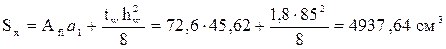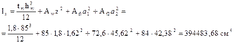 A= Af 1+ Af 2+ Aw = 33,6 + 45 + 85×1,8 = 231,6 см2 - площадь сечения балки.