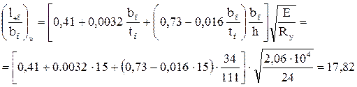 Поскольку (lef /bf )= 140/34 = 4,12< (lef /bf )u = 17,82, то устойчивость балки обеспечена и расчет на общую устойчивость выполнять не требуется.