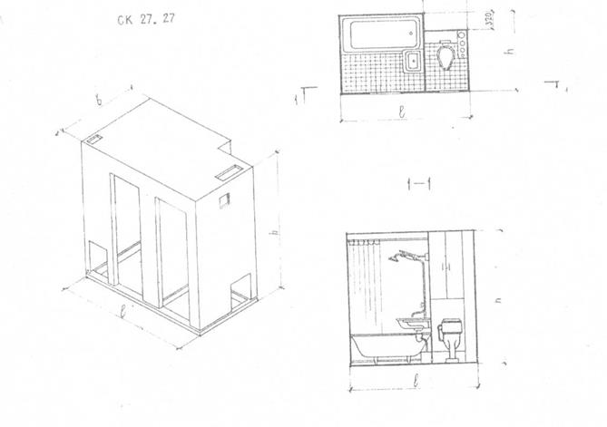 Санитарные узлы квартир запроектированы раздельными: два смежно-расположенных помещения ванной и туалетом. В однокомнатных квартирах – совмещенными. Размер санузла 2730x1600x2700 мм -сан. кабина СК1 27.27, показана на рисунке
