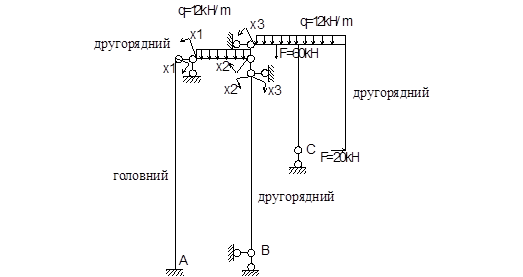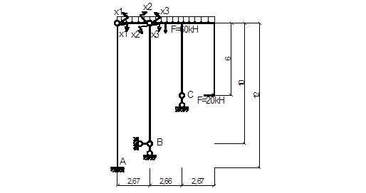 Основну систему методу сил вибираємо шляхом відкидання зайвих в’язей, навантаживши при цьому її зовнішніми силами та зусиллями відкинутих зайвих в’язей Х1 , Х2 , Х3 .