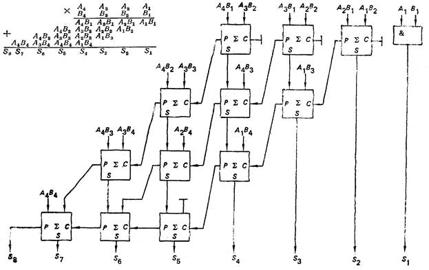 . Каждое последующее частное произведение сдвинуто на один разряд по отношению к предыдущему. Окончательное произведение получается последовательным суммированием частных произведений. Операнды полных сумматоров