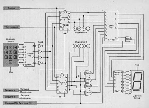 В рассматриваемой системе шифратор 74147 используется для преобразования десятичного выхода клавиатуры в двоичные числа; микросхема 7404 инвертирует сигналы на выходах этого шифратора. После инверторов двоичное число поступает на входы параллельной загрузки обоих регистров А и В. Индикаторы А и В показывают, какие двоичные числа находятся в данный момент в регистрах А и В соответственно; зафиксированные в регистрах двоичные числа А4 А3 А2 А1 и В4 В3 В2 В1 поступают на входы 4-разрядного сумматора 7483. Сумматор складывает эти числа, и сумма появляется в двоичной форме на выходах сумматора. Сумма преобразуется из двоичной формы в семисегментный код с помощью дешифратора 7447. Десятичная сумма появляется на цифровом выходном индикаторе.