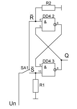 Набор составляют МП-12 (SA1), резисторы R1, R2, 2 элемента 2И-НЕ (DD4.2 и DD4.3) – К555ЛА3. Элементы 2И-НЕ подключены таким образом, что реализуют простейший RS триггер с инверсными входами. В исходном положении питание подано на инверсный вход R, а на инверсный вход S подключена земля. Резисторы R1, R2 выбраны номиналом 1кОм, чтобы ограничить входной ток до 1 мА. На прямом выходе Q формируется сигнал логической единицы. Если нажать кнопку, то начнется многократное замыкание-размыкание контактов – дребезг. Но при каждом нажатии на кнопку триггер реагирует только на первое замыкание и последующий дребезг не изменяет состояния триггера. При подаче уровня логической единицы на инверсный вход S, а логического нуля на инверсный вход R на прямом выходе Q получаем уровень логического нуля. При отпускании кнопки триггер возвращается в первоначальное состояние. Таки образом на выходе триггера формируется импульс прямоугольной формы.