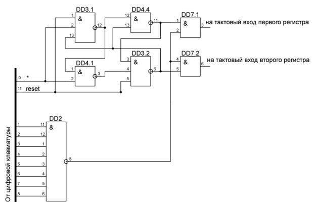 После действия сигнала reset на выходе реализованного на рисунке 3.3 Т-триггера (элемент DD4.4) уровень логической единицы. Если нажать любую из цифровых кнопок, то на выходе DD2 формируется уровень логической единицы и подается на DD7.1 и туда же подается уровень с выхода DD4.4, на выходе DD7.1 формируется уровень логической единицы, который разрешает запись в первый регистр. Туда записывается двоичный код нажатой цифровой кнопки. При нажатии кнопки умножить, Т-триггер изменяет свое состояние на противоположное, и таким образом, подключает второй регистр, для записи следующего двоичного кода.