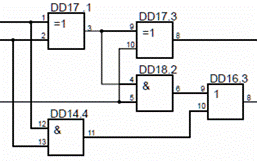 С DD8 и DD9 информация (множимое и множитель) поступают на вход умножителя реализованного комбинационным методом (рисунок 1.1). Схема сумматора который входит в состав умножителя изображена на рисунке 3.5. Умножитель ничем не тактируется, и не зависит ни от каких управляющих сигналов, а поэтому умножает всегда. Т.е. как только будет введено второе число (множимое), на выходе умножителя сформируется результат. А по нажатию кнопки равно он запишется в регистры DD26, DD27.