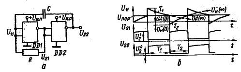 Отрицательной обратной связью через резистор R охвачен инвертор DD1. Самовозбуждение обеспечивается емкостной связью, охватывающей два инвертора. Релаксационные процессы перезаряда конденсатора С через резистор R, которые включены последовательно между выходами DD1 и DD2, определяют длительности полупериодов Т1, Т2 частоту генерации f, и скважность выходных импульсов Q.