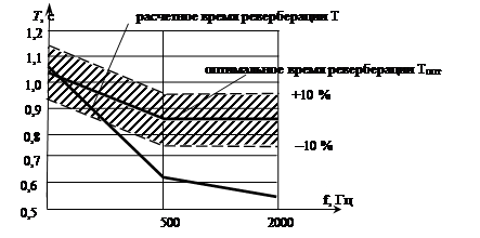11. Определенное расчетное время реверберации Т сравнивается с оптимальным временем реверберации Т опт , учитывая его допускаемые отклонения (±10%). Результаты расчета времени реверберации и сравнения его с оптимальным временем реверберациипредставляются в виде графика.