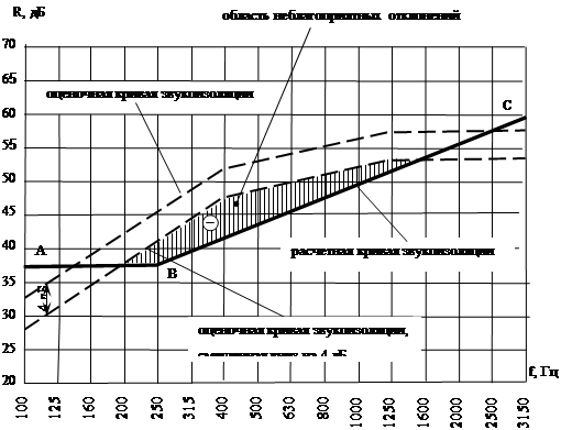 Из точки В вправо проводится отрезок ВС с наклоном 6 дБ на октаву (или 2 дБ на третьоктаву) до точки C с ординатой RС = 65 дБ. Из точки С вправо не проводится горизонтальный отрезок CD . Так как точка С лежит за пределами нормируемого диапазона частот (fС > 3150 Гц), отрезок CD отсутствует.