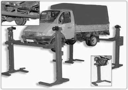 возможность организации рабочего места на любом свободном месте. Устанавливается на полу с допускаемым удельным давлением на него более 10 кг/см2 . 3.1.2. Подъемник ПП-6 передвижной автомобильный позволяет осуществлять подъем несколькими способами: за колеса, за колеса и за раму или лонжероны, только за раму или лонжероны. Возможен подъем практически всех типов автомобилей снаряженной массой не более 4,5 тонн и диаметром колесного диска от 20 до 22дюймов.