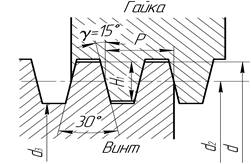 По таблицам стандарта выбираем резьбу Трап 34x6 ГОСТ 9484-83: d= 34мм; р = 6мм; d 1 = 28мм; d 2 = 31мм; d 3 = 27мм; H 1 = 0,5p = 3мм. |