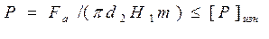 Из результата видно, что приспособление не только выдержит массу автомобиля ГАЗель (3,5 т), но и имеет огромный ресурс работы. Проверка резьбы приспособления на смятие. Характеристика резьбы[4]: - Резьба общего назначения, треугольная, однозаходная ГОСТ 9150-59; - шаг резьбы Р = 3,5мм; -наружный диаметр резьбы винта d = 30мм; -внутренний диаметр резьбы винта d 1 = 26,211мм; -средний диаметр резьбы винта и гайки d 2 = 27,73мм; -высота гайки Н = 100мм; -высота резьбы h = 1,89мм; -материал - Ст. 3. |