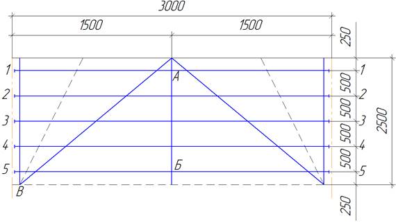 В соответствии с заданием принимаем ограждение покрытия из асбестоцементных волнистых листов обыкновенного профиля по ГОСТ 16223 «Листы асбестоцементные волнистые обыкновенного профиля и детали к ним», с размерами листа 1750х1125 мм и сборных дощатых щитов размером 3000х2500мм. Длина щита равняется принятому шагу ферм. Схема кровельного щита представлена на рисунке 2.