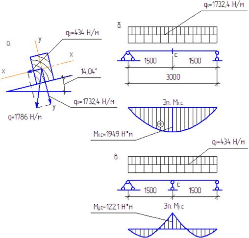 - в плоскости перпендикулярной скату, как разрезные балки с расчетным пролетом l = 3,0 м
