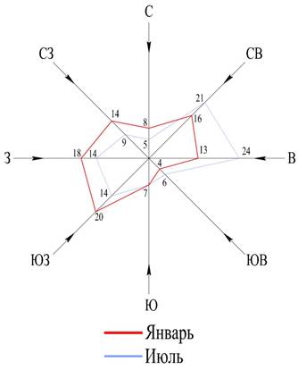 ¾ Преобладающие ветры: летом – юго-западный (ЮЗ) и западный (З), зимой – северо-восточный (СВ) и восточный(В)