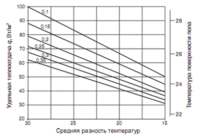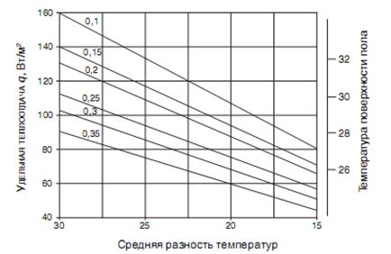 Определяем требуемую расчетную удельную теплоотдачу контура q = 1301/10,09 = 128,9 Вт/м2. По номограмме приложения Д1 определяем требуемую температуру пола для создания теплоотдачи 128,9 Вт/м2. Получили значение 31,6 0 С, что значительно выше допустимого 260 С. Для заданной температуры пола 260 С определяем для принимаемого нами шага укладки труб b =0,3 м требуемую величину средней разности температур ∆tср= 19,5 и удельную теплоотдачу поверхности пола q=68 Вт/м2 .
