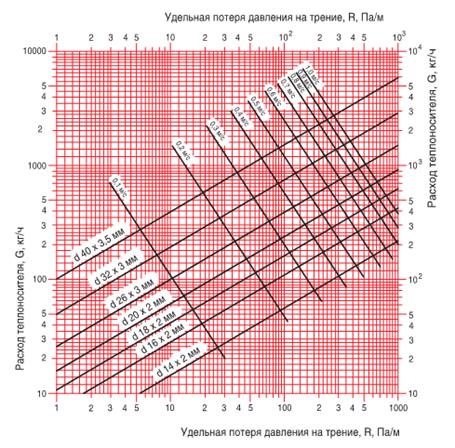 Значение удельной потери давления на трение R(Па/м), определим по номограмме: