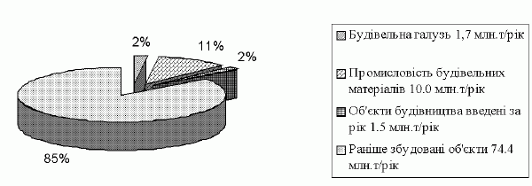 Будівельний сектор економіки витрачає близько 30 % від споживання в Україні палива. Всього будівельна галузь України до початку економічної кризи (1999) споживала 87,6 млн. т умовного палива на рік, з яких 74,4 млн. т (85 %) витрачалось в експлуатованих будинках. Структура витрати палива в будівельній галузі і житловому будівництві наведена на рис. 1.