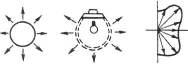 Для дальнейших расчетов берем один светильник с пятью лампами накаливания. Для выбранной лампы БК220-100 световой поток составляет 1450 лм (по таблице 4.31, с. 134 [3]), т.е. общий световой поток для пяти ламп равен 1450 х 5 = 7250 лм. По таблице 4.39, с. 147 [3] выбираем светильник рассеянного света с лампами накаливания, схема распределения света, схема светильника и кривая светораспределения приведены на рисунке 3.13. Рассчитываем освещенность в точке М на горизонтальной поверх- ности от светильника по формуле (4.28), с. 171 [3]: E г = (I α /Н р 2 ) cos3 α, (3.13)