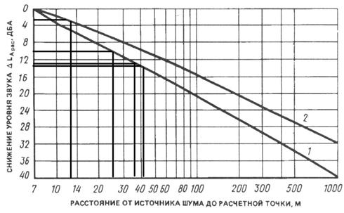 | счетных точек до середины светопроема рассчитываемого помещения (до точки В ): – для точки 1 – 13,3 м; – для точки 2 – 26,2 м; – для точки 3 – 40,7 м; – для точки 4 – 36,2 м. По графику (рисунок 8.24, с. 347 [3]) определяем снижение уровня звука в зависимости от расстояния между источником шума и расчѐтной точкой В (данные приведены на рисунке 3.16): – для точки 1 – 3 дБА; – для точки 2 – 10 дБА; – для точки 3 – 13,5 дБА; – для точки 4 – 13 дБА.