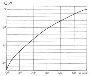 | уровень звука в точке М : 66,0 – 45,0 = 21,0 дБА => 66,0 + 0,0 = 66,0 дБА; 78,0 – 66,0 = 12,0 дБА => 78,0 + 0,3 = 78,3 дБА; 83,0 – 78,3 = 4,7 дБА => 83,0 + 1,3 = 84,3 дБА. Таким образом, максимальный уровень звука от выбранных внутренних источников шума в точке М составляет: LМ внут = 84,3 дБА. 3.2.1.7. Проводим анализ пикового ожидаемого уровня шума одновременно от внешних и внутренних источников в точке М помещения, сложив ожидаемый уровень шума от внешних источников с максимальным кратковременным внутренним уровнем шума по номограмме (рисунок 3.17): 84,3 – 63,1 = 21,2 дБА => 84,3 + 0,0 = 84,3 дБА. Рассчитанный пиковый уровень звука в точке М также значительно превышает допустимые нормативные значения (таблица 3.2). 3.2.2 Расчет индекса изоляции шума, времени реверберации и геометрических отражений. 3.2.2.1 Определяем индекс изоляции воздушного шума RW , дБА, по графику (рисунок 8.29, с. 353 [3]) для внутренней стены расчетного помещения. Материал стены – керамзитобетон плотностью 1000 кг/м3 и толщиной 0,2 м, т.е. поверхностная плотность равна (рисунок 3.18): m = 1000 х 0,2=200 кг/м2 . По рисунку 3.18 определяем индекс изоляции воздушного шума материалом стены: RW = 43,5 дБ.