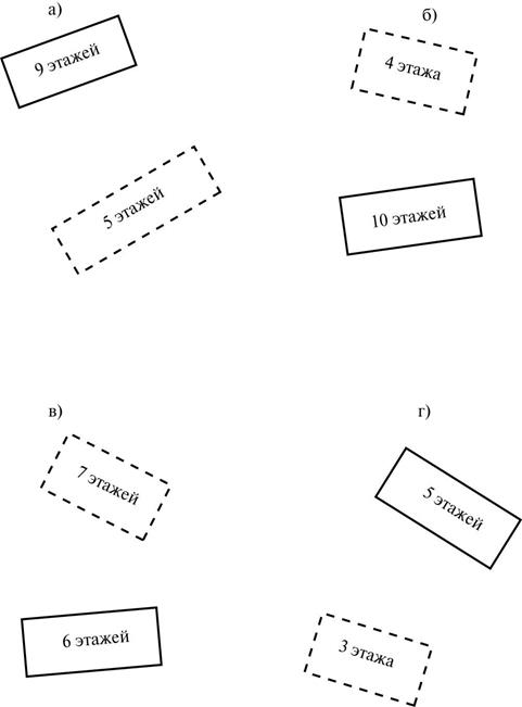 Генплан для 1 раздела вычерчивается в масштабе 1:500 каждым студентом учебной группы индивидуально (участок строительства считается горизонтальным), указывается расположение двух зданий – выбранного объекта строительства и здания окружающей застройки этажностью от 3 до 10 этажей (этажность двух зданий должна быть разной). Направление севера и расчетная точка А на территории застройки указываются преподавателем при выдаче задания. Пример оформления генплана для 1 раздела курсовой работы приведен в разделе 3 методических указаний. Некоторые варианты расположения зданий на генплане к 1 разделу приведены в приложении А (здания не должны быть параллельны или перпендикулярны друг к другу). Сплошные толстые линии на всех рисунках, приведенных в методических указаниях, относятся к строящемуся зданию, штриховые – к зданию окружающей застройки. Для облегчения чтения расчетных рисунков при выполнении курсовой работы вместо сплошных толстых линий применяются красные линии, штриховых – зеленые. Линии, касающиеся расчетного помещения, в схемах выделяются синим цветом.