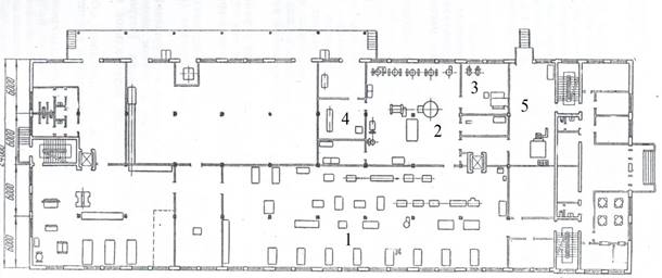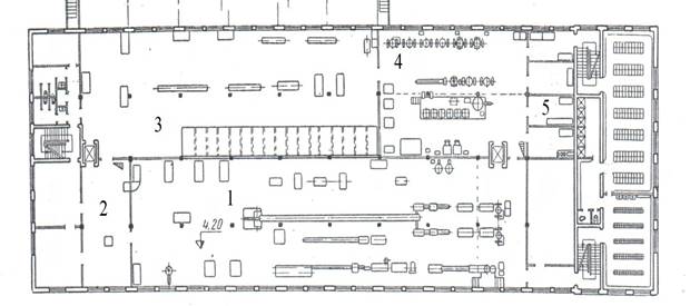 1 – цех выработки розничных сортов конфет; 2 – варочное отделение; 3 – отделение выработки вафельных листов; 4 – помещение для слива патоки; 5 – обжарочное отделение;