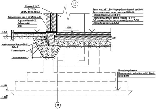В данном проекте запроектированы тавровые фундаментные балки, т.к они более экономичны по расходу бетона и стали. Во избежание деформаций при замерзании грунтов, балку с боков и снизу засыпают шлаком. Верхняя грань фундаментной балки расположена на отметке - 0.030. Поверх балки укладывается гидроизоляция из цементно-песчаного раствора.