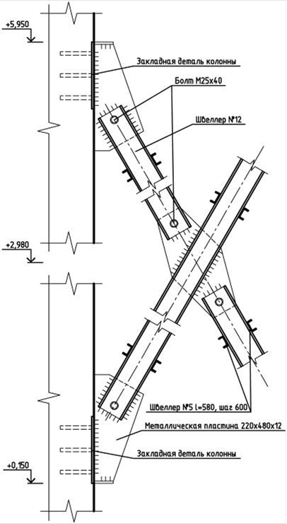 Конструкции промышленных зданий должны обладать пространственной жёсткостью. При прогонных покрытиях жёсткость обеспечивают только связями. Связи подразделяют на вертикальные и горизонтальные, первые устраивают между колоннами и в покрытии, вторые только в покрытии. Связи не только обеспечивают жёсткость каркаса здания, но и воспринимают горизонтальные нагрузки (ветровые, тормозные от мостовых кранов). Конструкция связей зависит от высоты здания, величины пролёта, шага колонн каркаса, наличия мостовых кранов и их грузоподъёмности. В данном проекте использованы крестообразные связи между колонн с шагом 6м и связи в покрытии. Связи в покрытиях выбирают с учетом вида каркаса, типа покрытия, высоты здания, вида внутрицехового подъемно - транспортного оборудования, его грузоподъемности и режима работ. Связи по колоннам установлены в середине температурного блока. Связи в покрытии установлены в середине и по краям температурного блока.