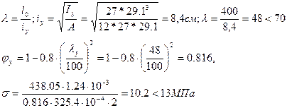 т.е. прочность обеспечена с большим запасом прочности. Однако, оставляем ранее принятые размеры поперечного сечения, исходя из необходимости ограничения гибкости.
