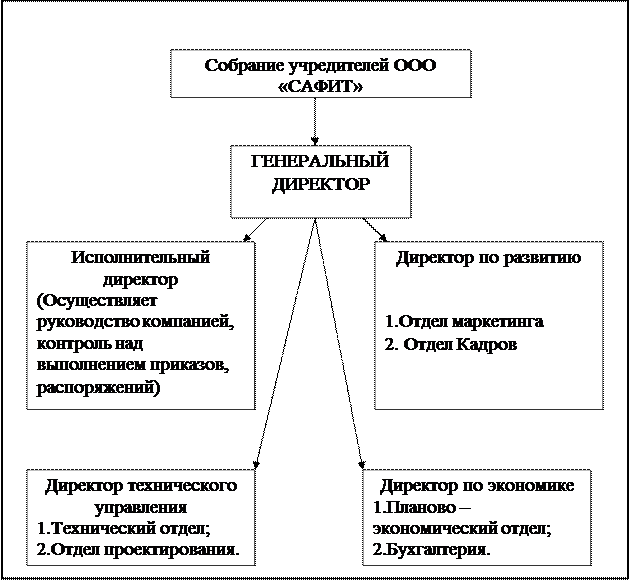Генеральный Директор имеет в качестве заместителей директора по развитию, исполнительного директора, директора технического управления. В подчинении директора по развитию находиться отдел маркетинга, который занимается рекламой, сбором информации, организацией выставок, расширением рынков сбыта, также отдел кадров, занимающийся подбором персонала. Директор технического управления, в его подчинении находится технический отдел, отдел проектирования.