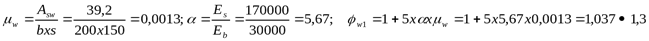 Выполним расчет прочности наиболее опасного сечения балки на действие поперечной силы на опоры В слева .Из условия сварки принимаем поперечные стержни диаметром 5 Вр-I (Rsw=260 МПа, Es=170000 МПа), число каркасов – два (Asw=19,6х2=39,2 мм2). Назначаем максимально допустимый шаг поперечных стержней s=150 мм согласно требованиям п. 5.27 [2].